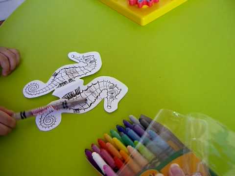 We tried to colour pictures of seahorse, starfish, clownfish, coral reef and clam etc. Then I stuck them to some strings and attached them to a paper plate with pipe cleaners.